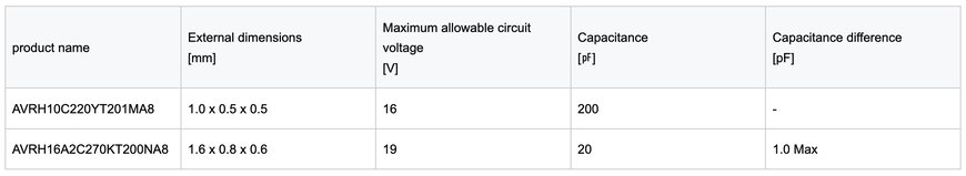 AVRH16A2C270KT200NA8は1つの素子に2つのバリスタ機能が入った2in1アレイ形状とっており、また当社独自の設計技術によりチャネル間の静電容量の差を最小限に抑えていることが特徴です。サイズは1608サイズ(L1.6mm×W0.8mm×H0.6mm)です。