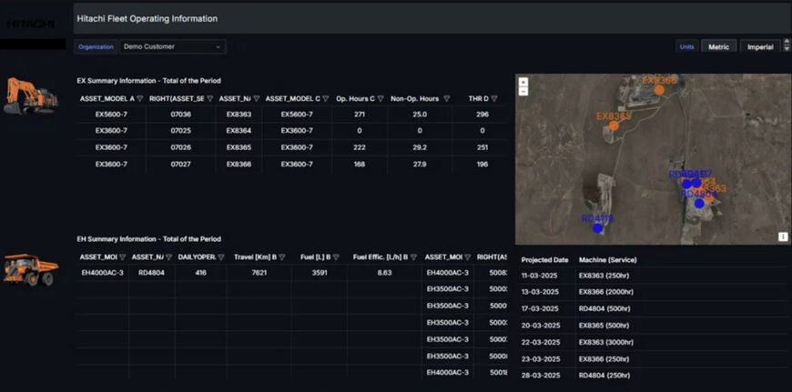日立建機ブランドの鉱山機械の稼働状況・生産量・燃料消費量・位置情報などをほぼリアルタイムに取得してダッシュボードで閲覧できます。