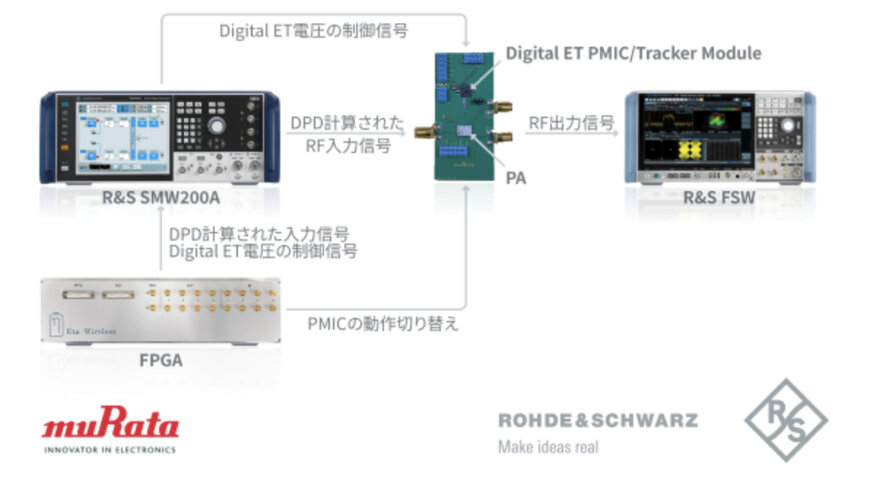 村田製作所は、Rohde & Schwarz GmbH & Co. KGと共同で、村田製作所独自の電力制御技術であるデジタルET(Digital Envelope Tracking)の効果を測定するRF(無線周波数)システムを開発しました。本システムを用いることで、5Gや6Gなどの通信機器におけるデジタルETの省電力効果を高精度に測定することが可能となります。